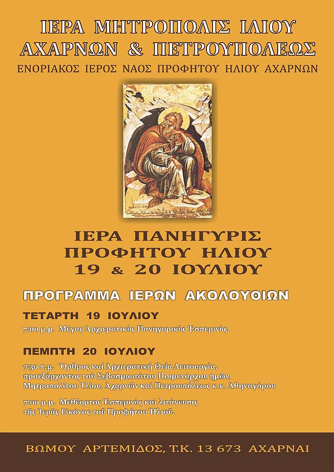 Πανηγυρίζει η ενορία του Προφήτου Ηλιού Αχαρνών, στις 19 και 20 Ιουλίου 2023, σύμφωνα με το ακόλουθο πρόγραμμα: