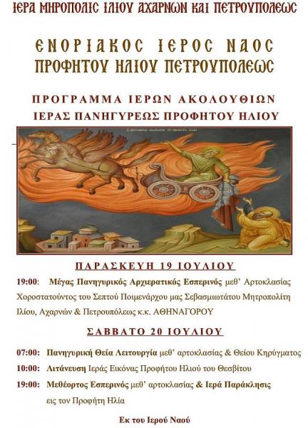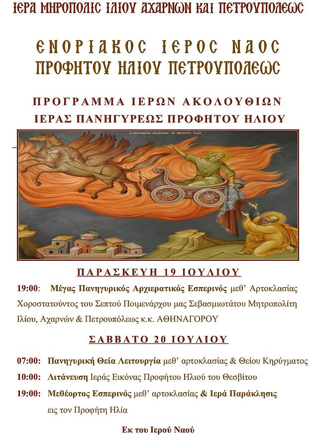 Η ιερά πανήγυρις του Προφήτου Ηλιού στον ναό του στην Πετρούπολη θα πραγματοποιηθεί σύμφωνα με το ακόλουθο πρόγραμμα: