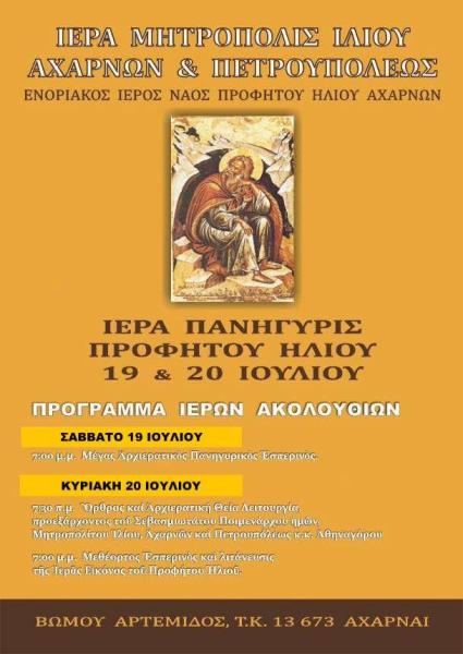 Η Ιερά Πανήγυρις του Ιερού Ναού Προφήτου Ηλιού Αχαρνών θα τελεστεί στις 19 και 20 Ιουλίου 2025, σύμφωνα με το ακόλουθο πρόγραμμα: