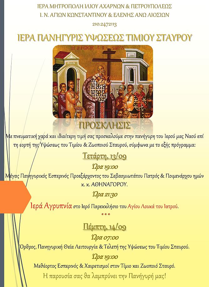 Με πνευματική χαρά και ιδιαίτερη τιμή σας προσκαλούμε στην πανήγυρη του Ιερού μας Ναού επί τη εορτή της Υψώσεως του Τιμίου και Ζωοποιού Σταυρού, σύμφωνα με το εξής πρόγραμμα: