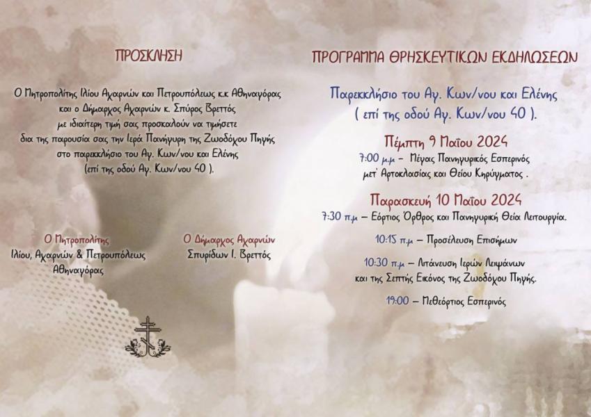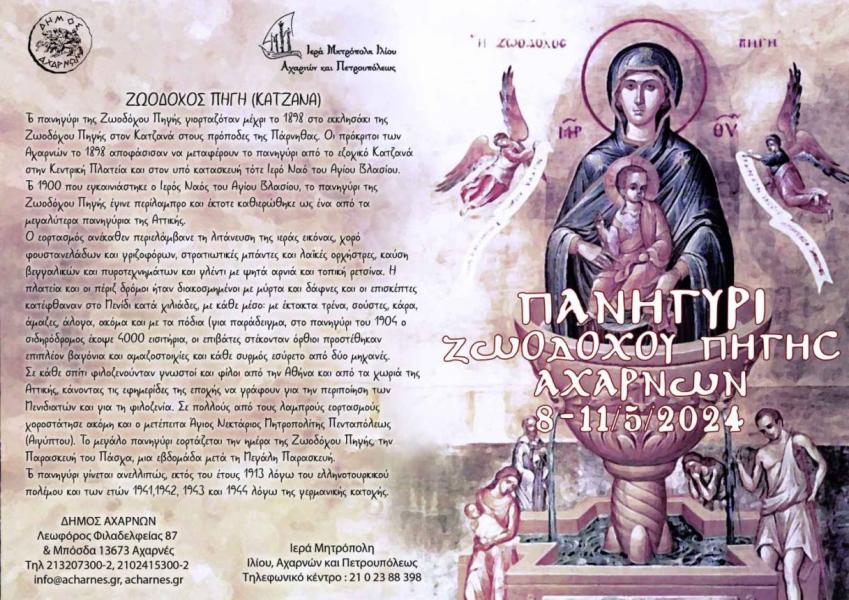 Το πανηγύρι της Ζωοδόχου Πηγής στις Αχαρνές εορτάζεται από το 1898 ανελλιπώς, εκτός από τα έτη 1913, 1941-1944, κατά τα οποία η χώρα μας βρισκόταν σε πολεμικές περιπέτειες και κατοχές. Εορτάζεται, λοιπόν, κι εφέτος, το 2024, σύμφωνα με το ακόλουθο πρόγραμμα: