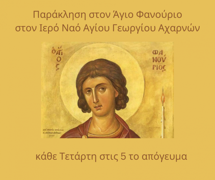 Παράκληση στον Άγιο Φανούριο τελείται κάθε Τετάρτη στις 5 μ.μ. στον Ιερό Ναό Αγίου Γεωργίου Αχαρνών.
