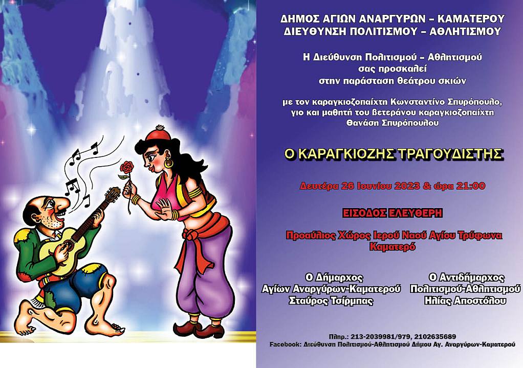 Στα πλαίσια των εκδηλώσεων για την πανήγυρη του Αγίου Μεδίκου του αναργύρου ιατρού και μάρτυρος, η Διεύθυνση πολιτισμού και αθλητισμού του Δήμου Αγίων Αναργύρων-Καματερού και η ενορία του Αγίου Τρύφωνα Καματερού παρουσιάζουν παράσταση Θεάτρου Σκιών της οικογένειας Σπυρόπουλου, τη Δευτέρα 26 Ιουνίου 2023, στις 21:00.