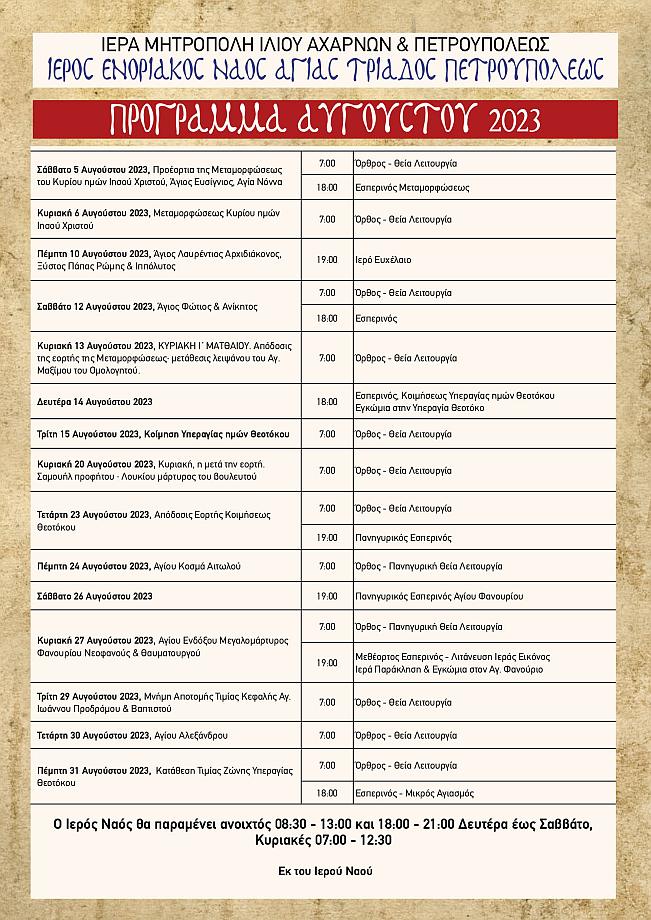 Πρόγραμμα ακολουθιών Αυγούστου 2023 ενορίας Αγ. Τριάδος Πετρ.