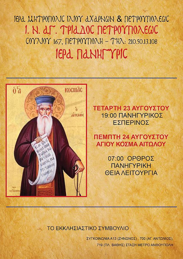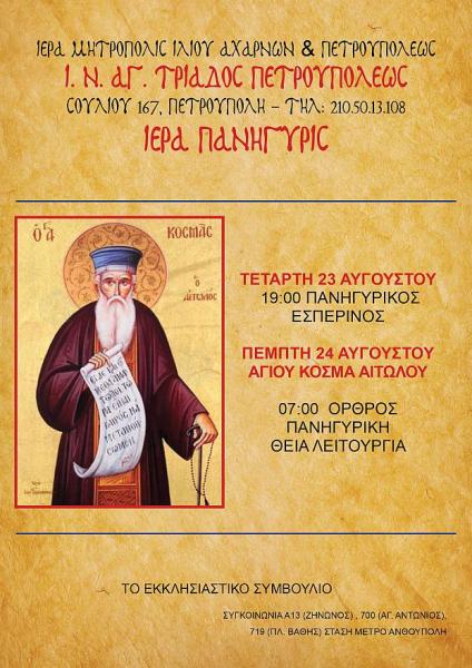 • Η πανήγυρις του Αγίου Κοσμά του Αιτωλού: την Τετάρτη 23 Αυγούστου θα τελεστεί Πανηγυρικός Εσπερινός και την Πέμπτη 24 Αυγούστου 2023 ώρα 07:00 Όρθρος - Πανηγυρική Θεία Λειτουργία και στις 19:00 Παράκληση στον Άγιο Κοσμά Αιτωλό στην Εικόνα η οποία θυσαυρίζεται στην Ενορία μας.