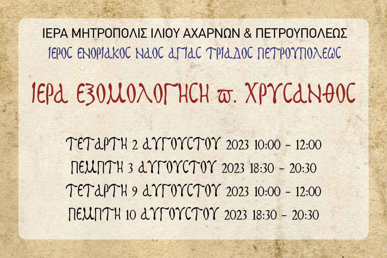 • Το Μυστήριο της Ιεράς Εξομολογήσεως το οποίο θα τελεί ο π. Χρύσανθος, την Τετάρτη 2 και 9 Αυγούστου 10:00-12:00 και την Πέμπτη 3 και 10 Αυγούστου 18:30-20:30.