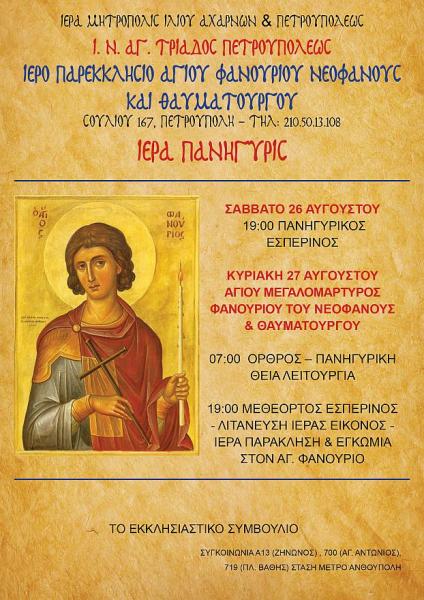 • Η Πανήγυρις του Παρεκκλησίου της Ενορίας μας Αγίου Φανουρίου Νεοφανούς και Θαυματουργού: το Σάββατο 26 Αυγούστου 2023 θα τελεστεί ώρα 19:00 Μέγας Πανηγυρικός Εσπερινός μετά αρτοκλασίας και θείου κηρύγματος. Την Κυριακή 27 Αυγούστου 2023 ο Όρθρος - η Πανηγυρική Θεία Λειτουργία ώρα 07:00, το απόγευμα ώρα 19:00 ο Εσπερινός, η  Λιτάνευση της Ιεράς Εικόνος και τέλος Ιερά Παράκληση στον Άγιο Φανούριο. Κατά το διήμερο εορταστικών εκδηλώσεων θα ευλογούνται από τους Εφημέριους Ιερείς της Ενορίας μας οι φανουρόπιτες.