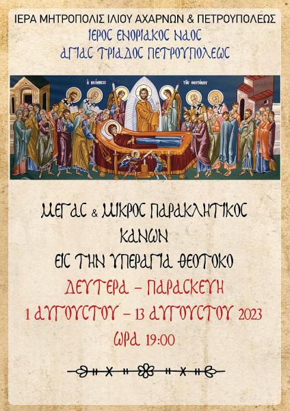 • Ο Μεγάλος και ο Μικρός Παρακλητικός Κανών στην Υπεραγία ημών Θεοτόκο ο οποίος θα τελείται από 1-13 Αυγούστου ώρα 19:00.