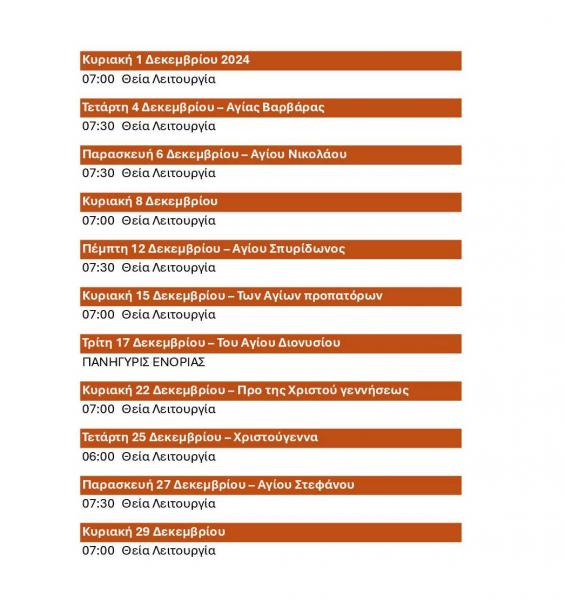 Πρόγραμμα ακολουθιών Δεκεμβρίου 2024 Αγίου Διονυσίου Αχαρνών