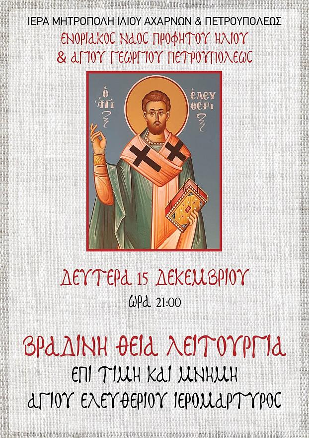 • Τὴν Δευτέρα 15 Δεκεμβρίου 2025, ὥρα 21:00, Βραδινὴ Θεία Λειτουργία, ἐπὶ τιμῇ καὶ μνήμη τοῦ Ἁγίου Ἐλευθερίου Ἱερομάρτυρος.