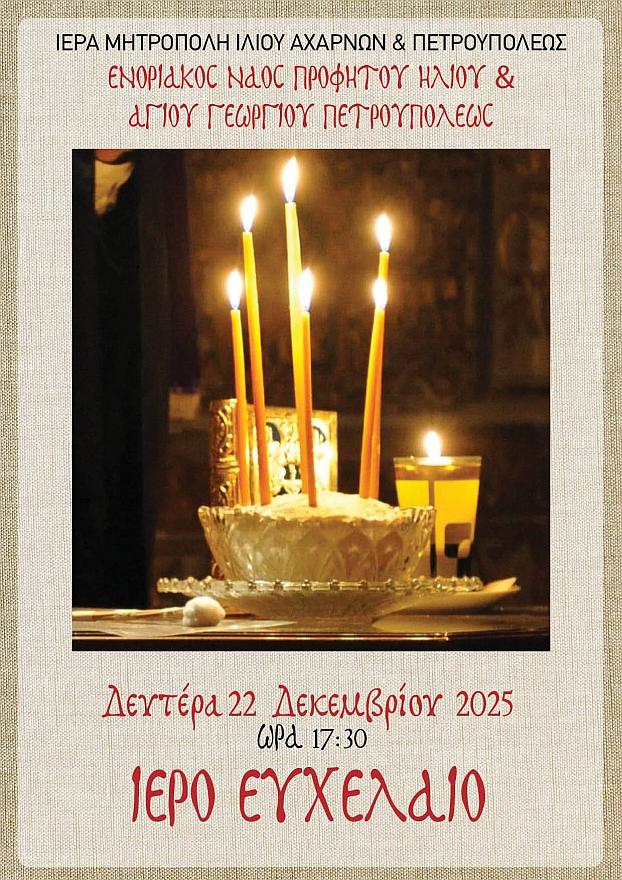 • Τὴν Δευτέρα 22 Δεκεμβρίου 2025, ὥρα 17:30, τὸ μυστήριο τοῦ Ἱεροῦ Εὐχελαίου.