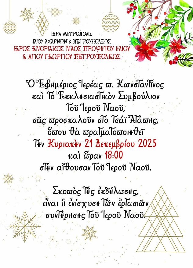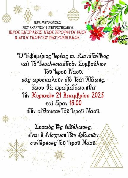 • Τὴν Κυριακὴ 21 Δεκεμβρίου 2025, ὥρα 18:00, Φιλανθρωπικὸ Τσάϊ στὴν αἴθουσα τοῦ Πνευματικοῦ Κέντρου.