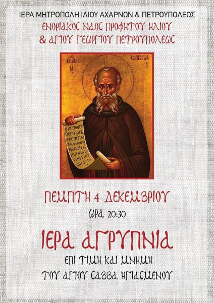 • Τὴν Πέμπτη 4 Δεκεμβρίου 2025, ὥρα 20:00 , Ἱερὰ Ἀγρυπνία ἐπὶ τιμῇ καὶ μνήμη τοῦ Ἁγίου Σάββα ἡγιασμένου.