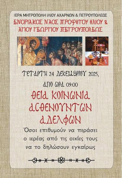• Τὴν Τετάρτη 24 Δεκεμβρίου 2025, μετὰ τὸ πέρας τῆς Θείας Λειτουργίας καὶ ὥρα 09:00, Θεία Κοινωνία στὶς οἰκίες τῶν ἀσθενούντων ἀδελφῶν, ἔπειτα ἀπὸ τὴν ἐνημέρωση τοῦ Ἱερέα π. Κωνσταντίνου, δηλώνοντας τὴν διεύθυνση, ὀνοματεπώνυμο καὶ τηλέφωνο.