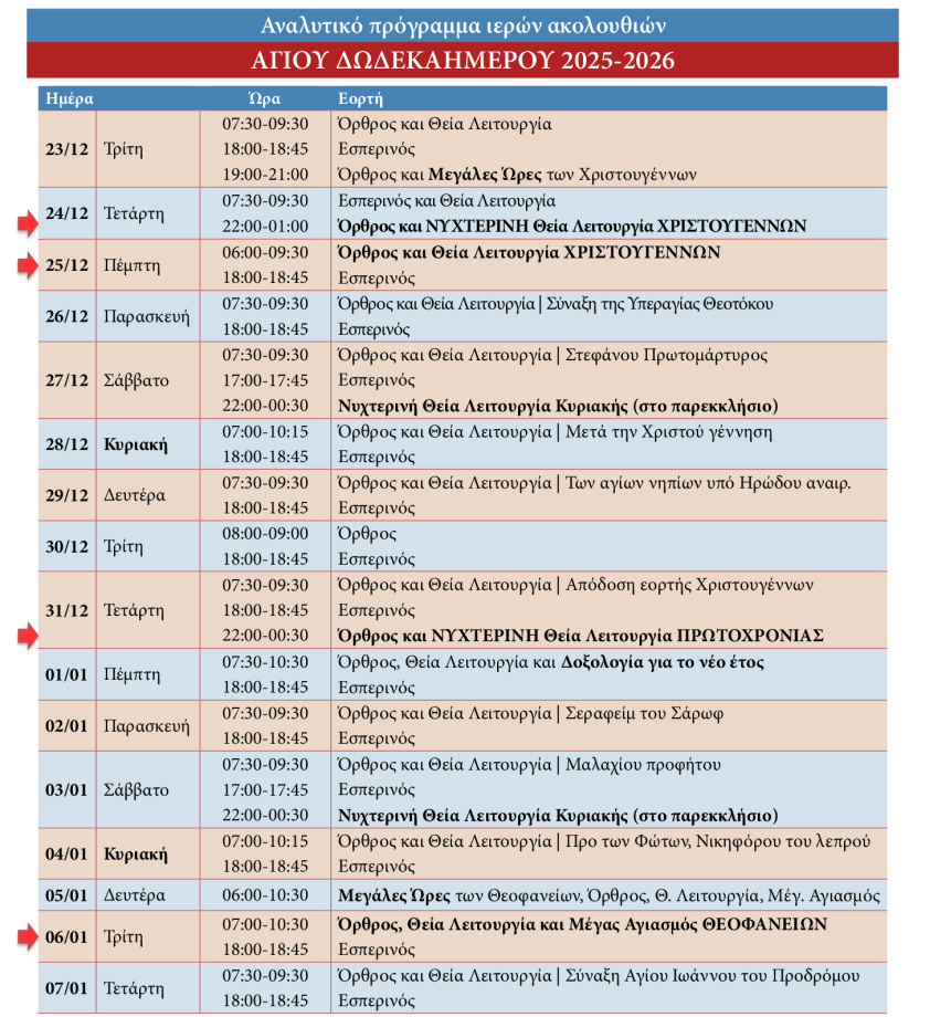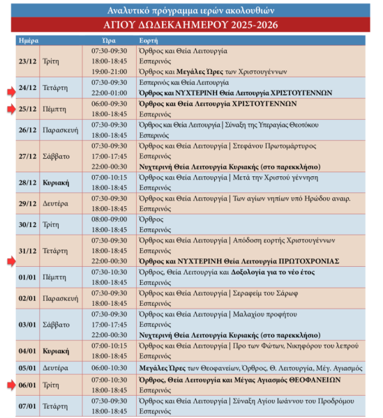 Αναλυτικό πρόγραμμα των ακολουθιών του Αγίου Δωδεκαημέρου 2025-2026, και πιο συγκεκριμένα από 23 Δεκεμβρίου 2025 έως 7 Ιανουαρίου 2026, στην ενορία της Αγίας Βαρβάρας Ιλίου.