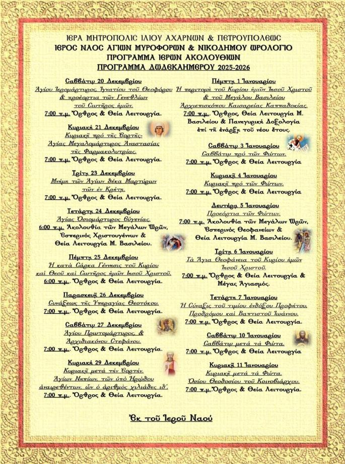 Δείτε το πρόγραμμα ακολουθιών του Αγίου Δωδεκαημέρου 2025, στην ενορία Αγίων Μυροφόρων και Νικοδήμου.