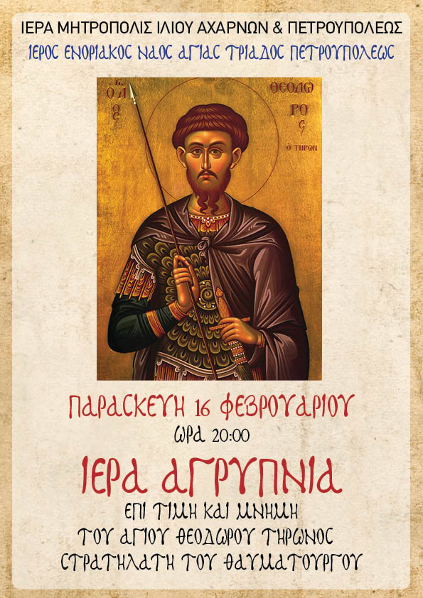 - Η Ιερά Αγρυπνία που θα τελεστεί την Παρασκευή 16 Φεβρουαρίου και ώρα 20:00 - 00:30, επί τιμή και μνήμη του Αγίου Θεοδώρου Τήρωνος του θαυματουργού.