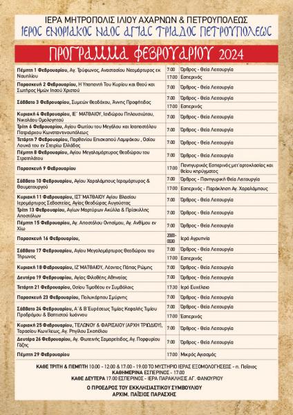 Πρόγραμμα ακολουθιών Φεβρουαρίου 2024 ενορίας Αγ. Τριάδας Πετρ.
