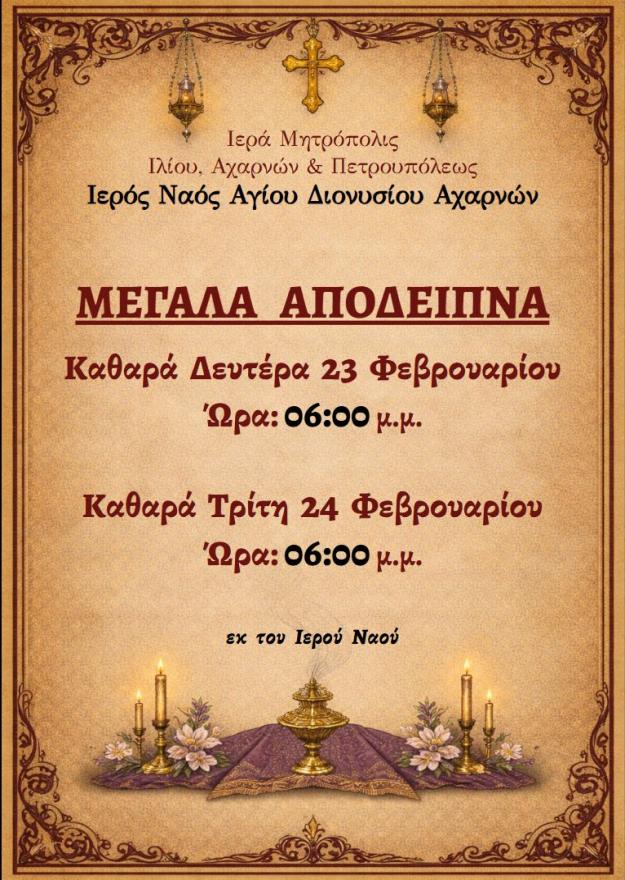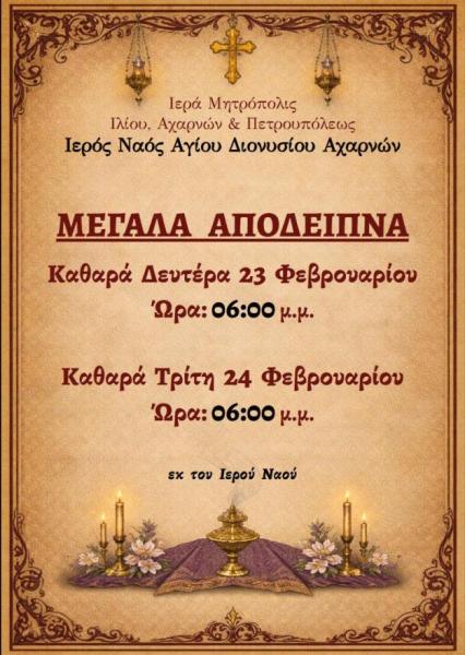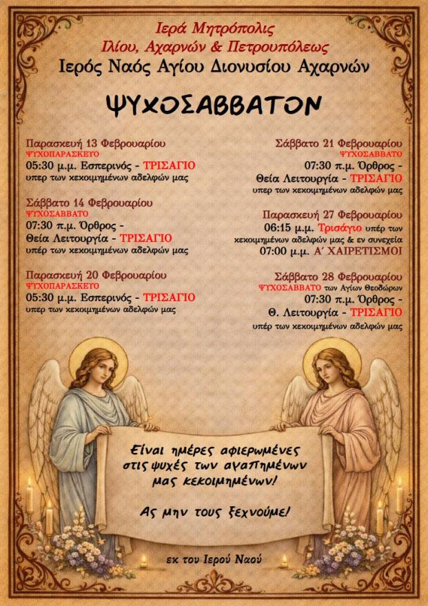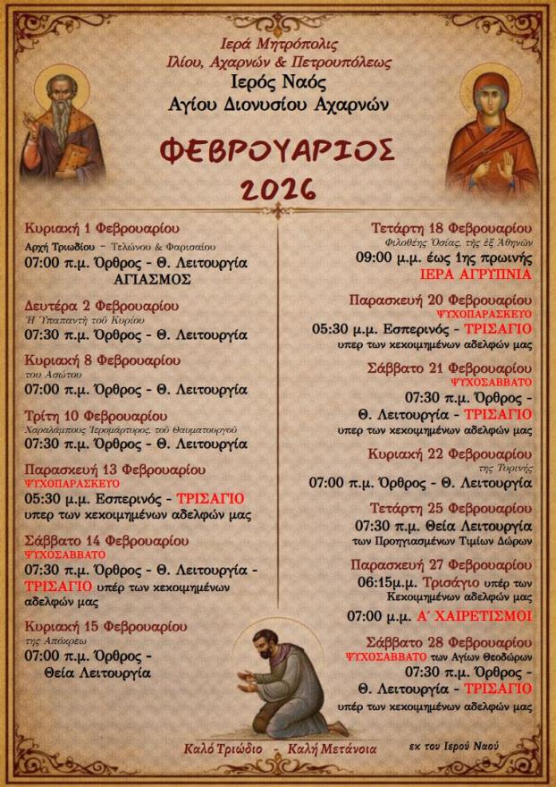 Πρόγραμμα ακολουθιών Φεβρουαρίου 2026 ενορίας Αγ. Διονυσίου Αχαρνών