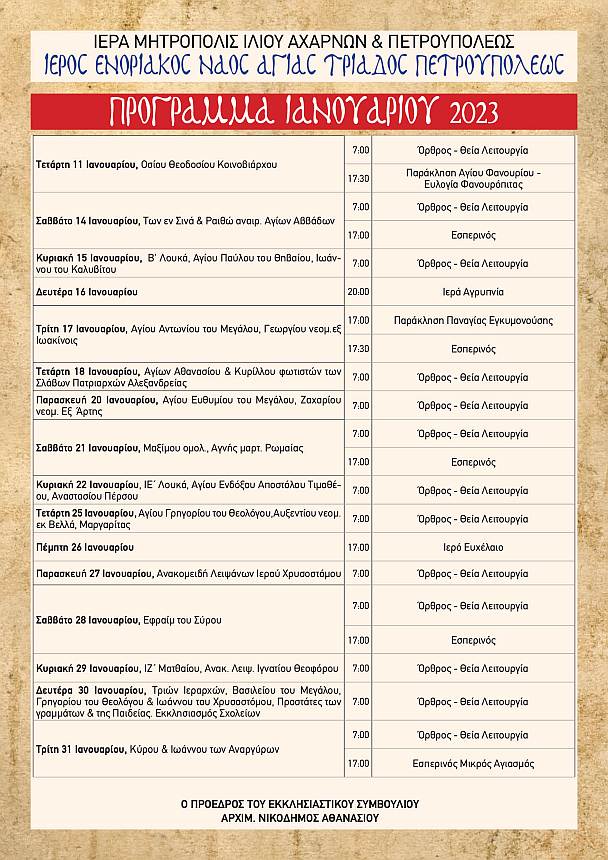 Δείτε το πρόγραμμα ακολουθιών στην ενορία της Αγίας Τριάδας Πετρουπόλεως, για τον μήνα Ιανουάριο 2023.