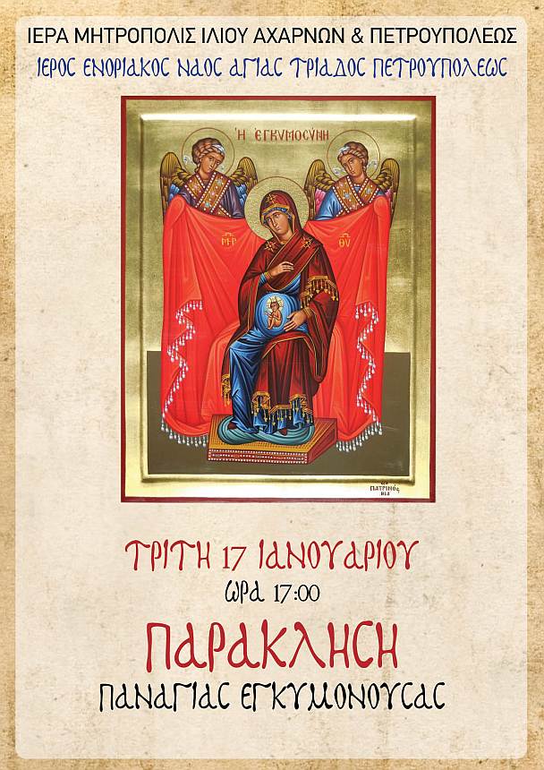 - Η Παράκληση στην Υπεραγία Θεοτόκο που θα τελεστεί την Τρίτη 17 Ιανουαρίου, στις 17:00.