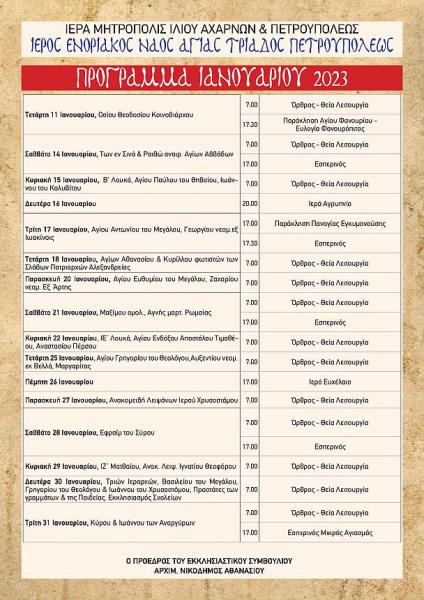 Πρόγραμμα ακολουθιών Ιανουαρίου 2023 Αγ. Τριάδας Πετρ.