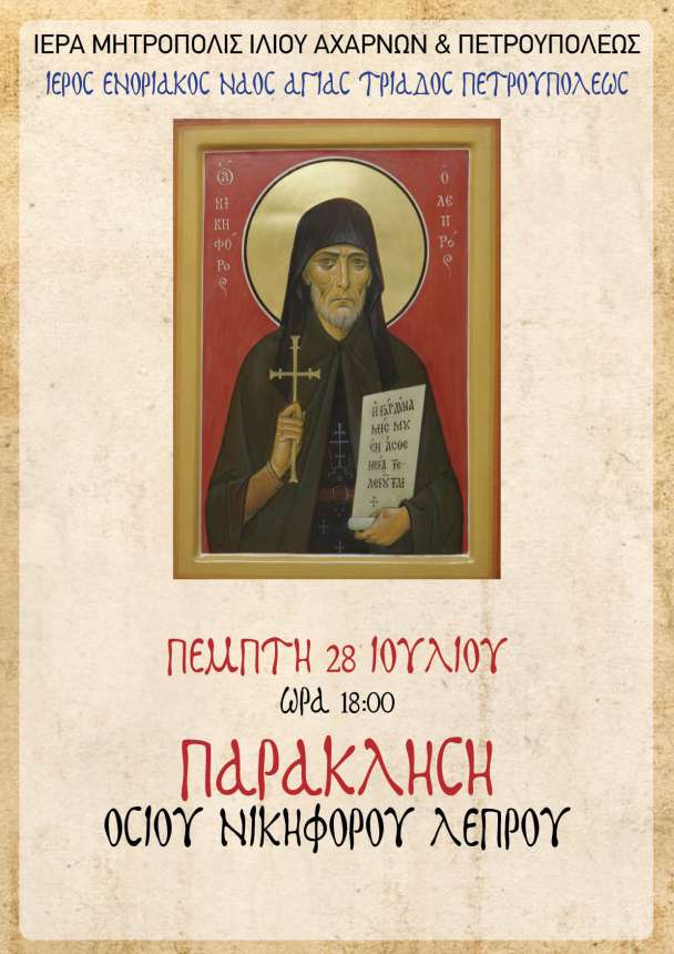 - Η Παράκληση στον Άγιο Νικηφόρο τον λεπρό που θα τελεστεί την Πέμπτη 28 Ιουλίου στις 18:00.