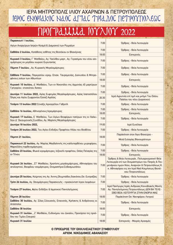 Πρόγραμμα ακολουθιών Ιουλίου 2022 ενορίας Αγ. Τριάδας Πετρ.