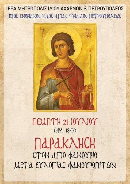- Η Παράκληση στον Άγιο Φανούριο που θα τελεστεί την Πέμπτη 21 Ιουλίου στις 18:00.