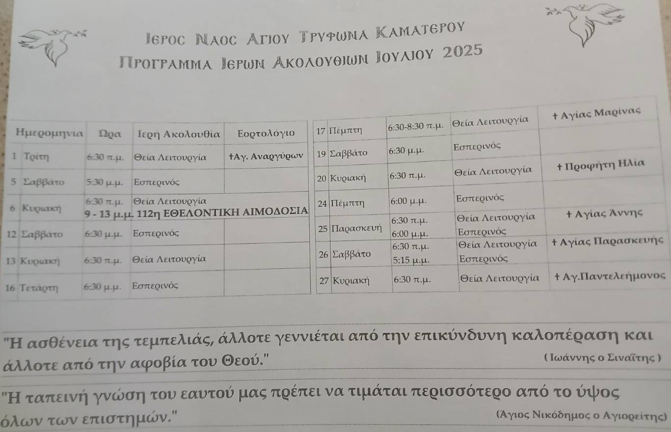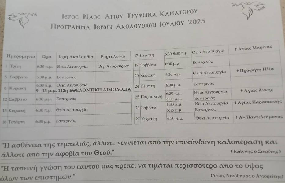 Πρόγραμμα ακολουθιών για τον μήνα Ιούλιο 2025 στην ενορία του Αγίου Τρύφωνος Καματερού.