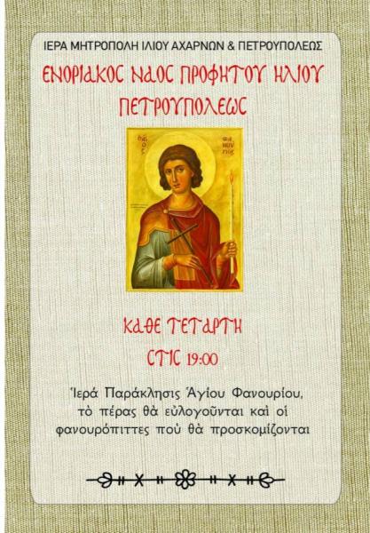 Κάθε Δευτέρα θα τελείται Ιερά Παράκληση στον Προφήτη Ηλία και κάθε Τετάρτη θα τελείται Ιερά Παράκληση στον Άγιο Φανούριο, ώρα 19:00.