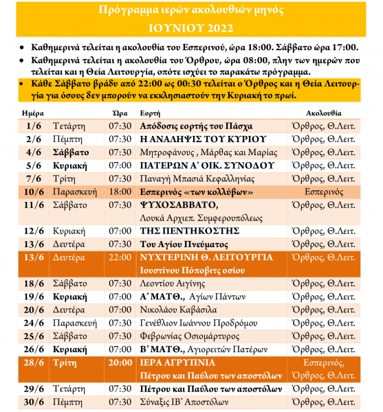 - Η Ιερά Αγρυπνία που θα τελεστεί την Τρίτη 28/6, από 20:00 έως 01:00 περίπου, επί τη μνήμη των Αγίων Αποστόλων Πέτρου και Παύλου.