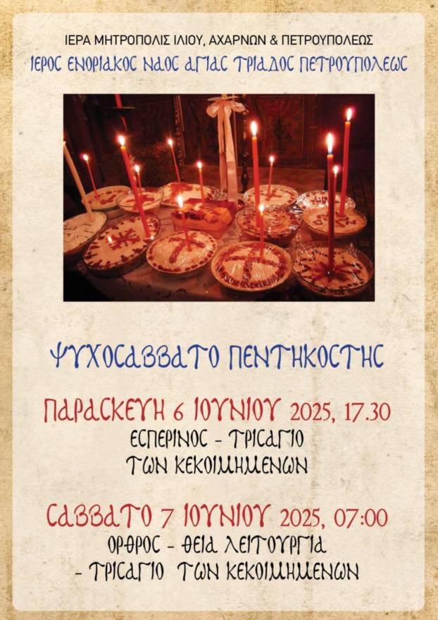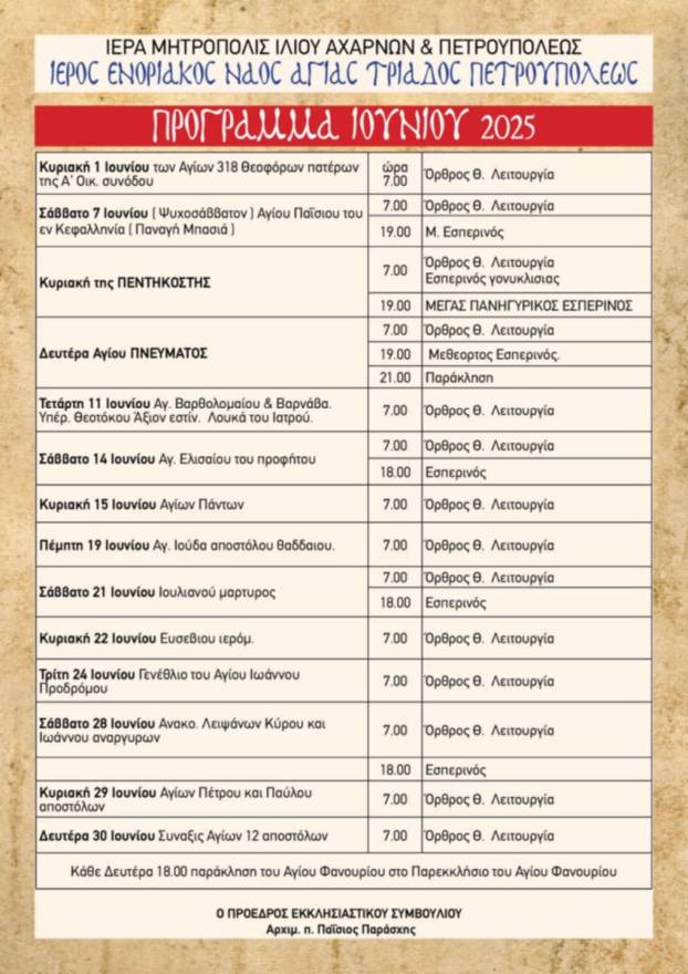 Δείτε το πρόγραμμα ακολουθιών Ιουνίου 2025 στην ενορία της Αγίας Τριάδας Πετρουπόλεως.