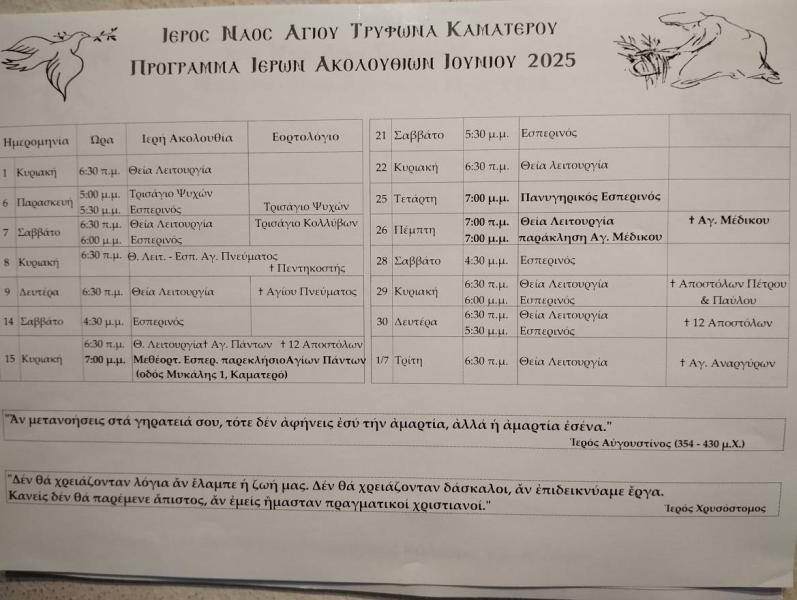 Πρόγραμμα ακολουθιών Ιουνίου 2025 ενορίας Αγ. Τρύφωνος Καματερού