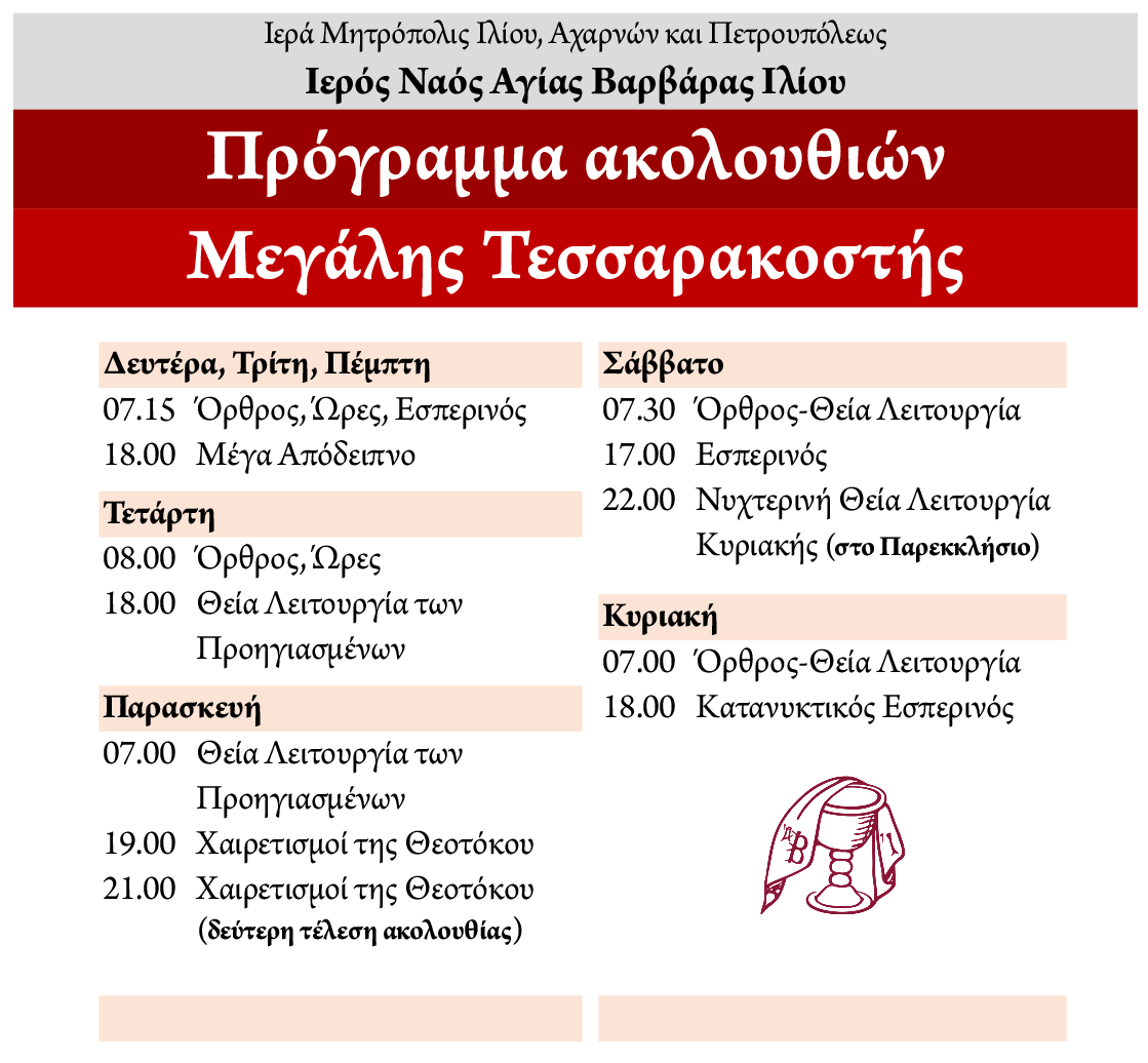 Δείτε το πρόγραμμα ακολουθιών όλων των εβδομάδων της Μεγάλης Τεσσαρακοστής 2022, στην ενορία της Αγίας Βαρβάρας Ιλίου.