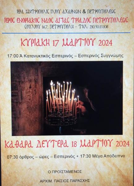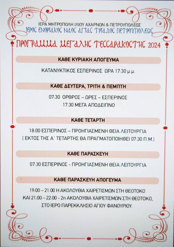 Το πρόγραμμα ακολουθιών της Αγίας Τεσσαρακοστής του Ιερού Ναού Αγίας Τριάδος Πετρουπόλεως είναι το ακόλουθο: