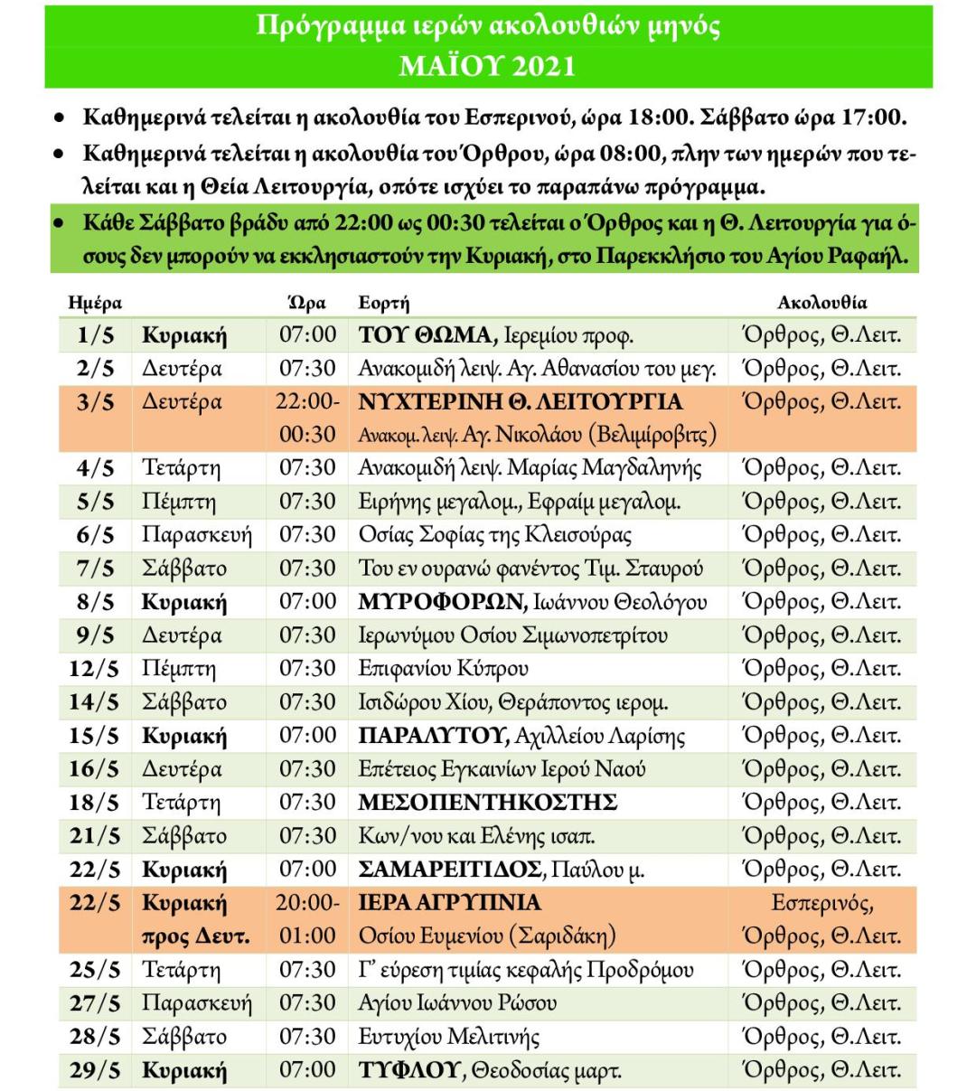 Πρόγραμμα ακολουθιών Μαΐου 2022 ενορίας Αγ. Βαρβάρας Ιλίου