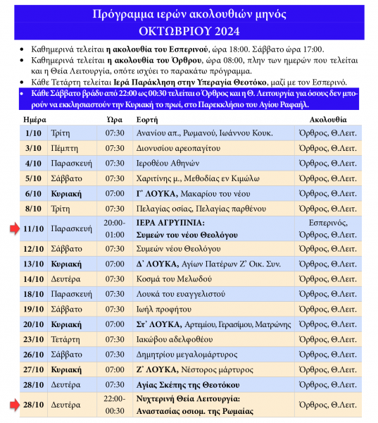- Η Ιερά Αγρυπνία που θα τελεστεί την Παρασκευή 11/10, από 20:00 έως 01:00, επί τη εορτή του Αγίου Συμεών του νέου Θεολόγου.