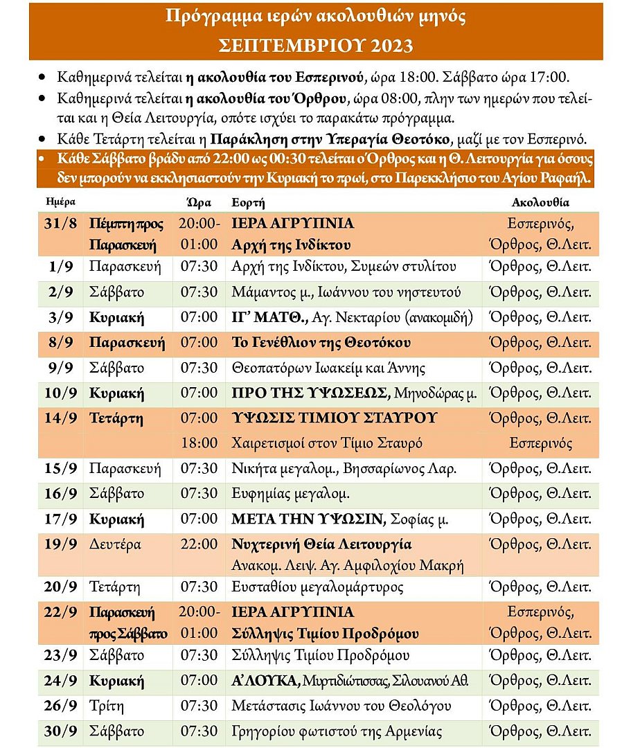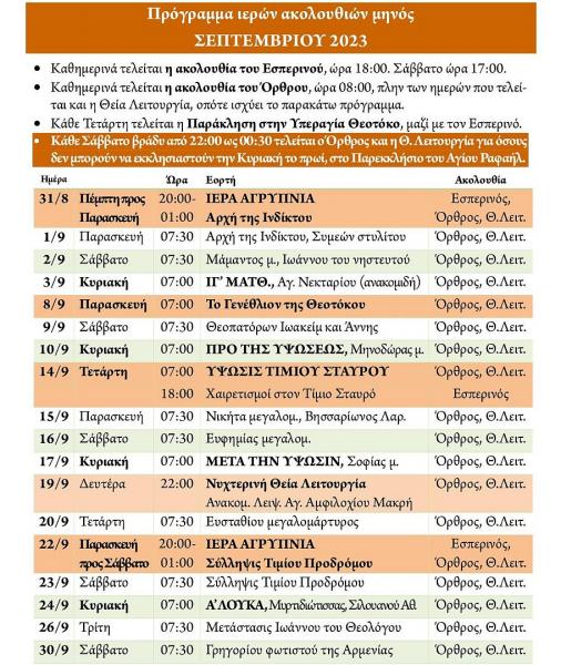 Πρόγραμμα ακολουθιών Σεπτεμβρίου 2023 ενορίας Αγίας Βαρβάρας Ιλίου