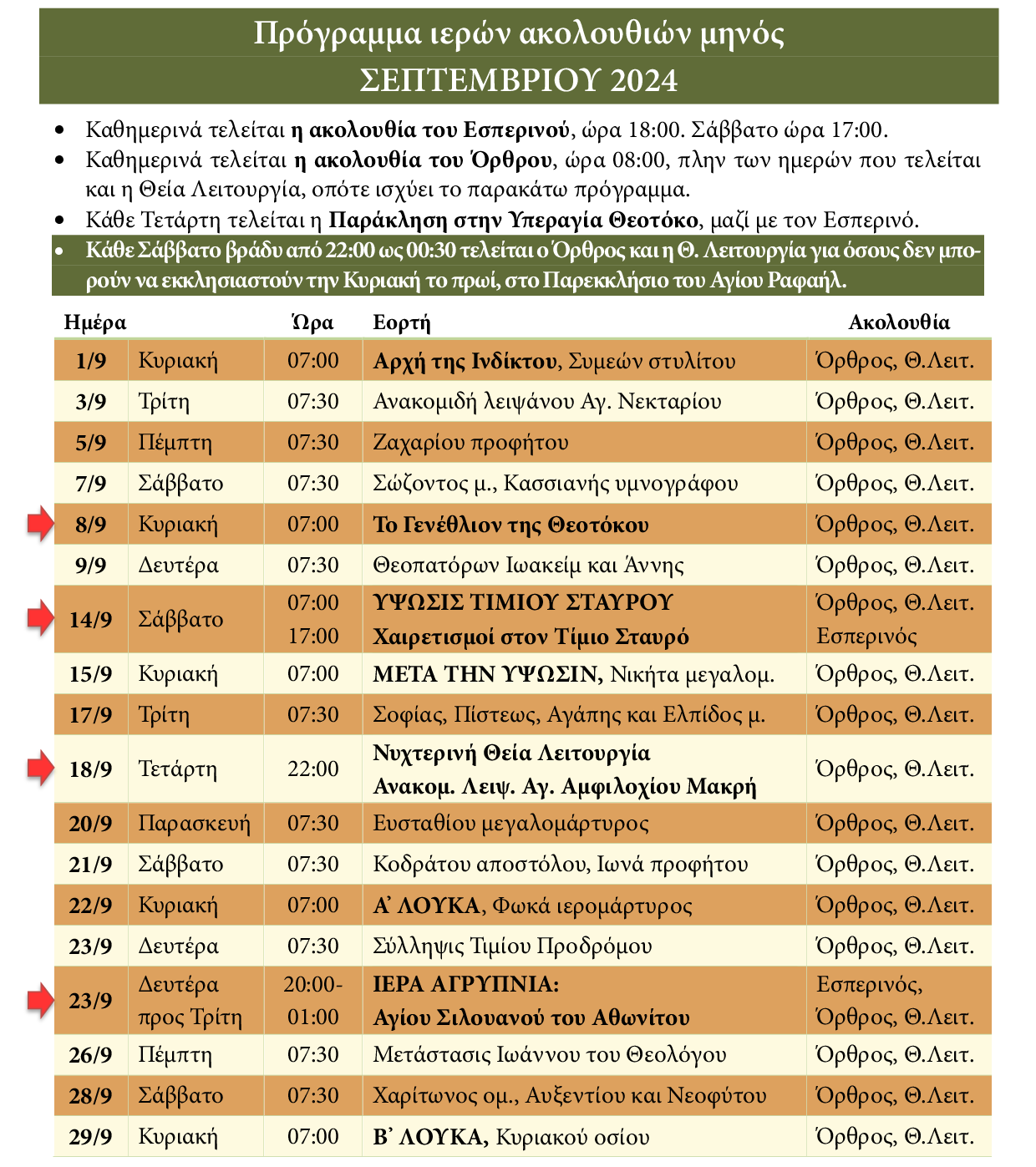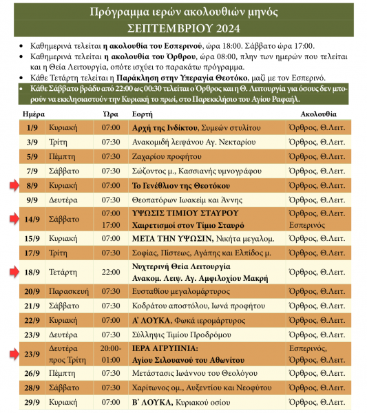 Πρόγραμμα ακολουθιών Σεπτεμβρίου 2024 ενορίας Αγίας Βαρβάρας Ιλίου
