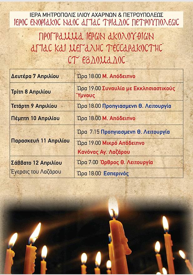 Πρόγραμμα ακολουθιών Στ' εβδομάδος Μ. Τεσσ. Αγίας Τριάδας Πετρ.