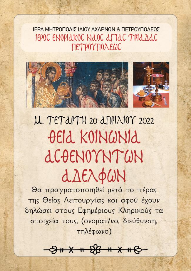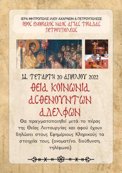 - Η Θεία Κοινωνία των ασθενών στο σπίτι, τη Μεγάλη Τετάρτη (δείτε σχετική αφίσα).