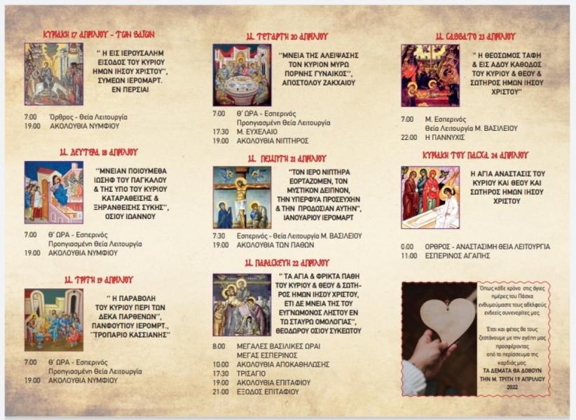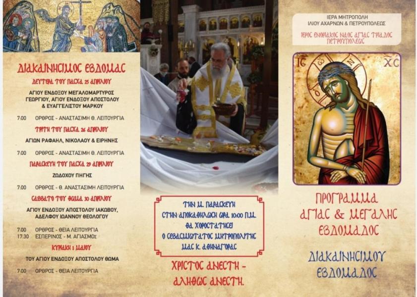 Δείτε το πρόγραμμα ακολουθιών για την Μεγάλη Εβδομάδα και τη Διακαινήσιμο Εβδομάδα του έτους 2022, στην ενορία της Αγίας Τριάδος Πετρουπόλεως.