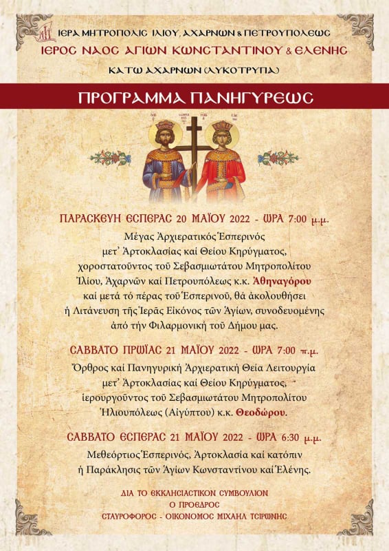 Πανηγυρίζει η ενορία των Αγίων Κωνσταντίνου και Ελένης Κάτω Αχαρνών, το Σάββατο 21 Μαΐου 2022, σύμφωνα με το ακόλουθο πρόγραμμα: