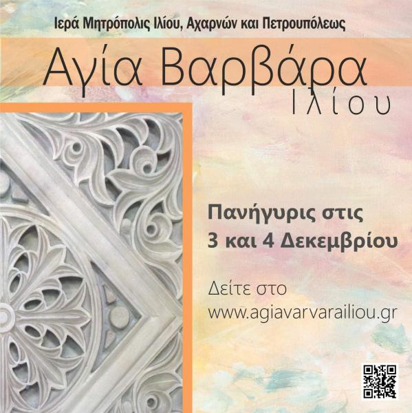 Το Σάββατο 3 και την Κυριακή 4 Δεκεμβρίου 2022 θα διεξαχθεί η πανήγυρις της προστάτιδας της ενορίας της Αγίας Βαρβάρας Ιλίου.