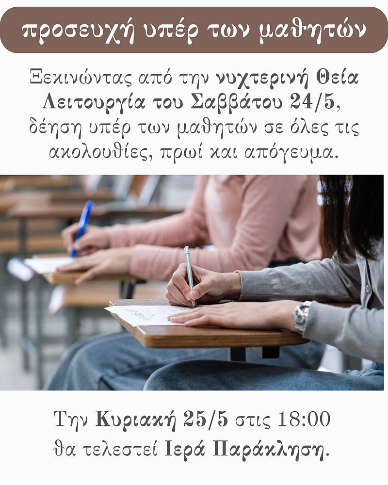 Ξεκινώντας από την νυχτερινή Θεία Λειτουργία του Σαββάτου 24/5, θα τελείται δέηση υπέρ των μαθητών σε όλες τις ακολουθίες στην ενορία της Αγίας Βαρβάρας Ιλίου, κάθε πρωί και απόγευμα, καθ' όλη τη διάρκεια της εξεταστικής περιόδου των σχολείων. Την Κυριακή 25/5 στις 18:00 θα τελεστεί Ιερά Παράκληση.