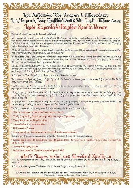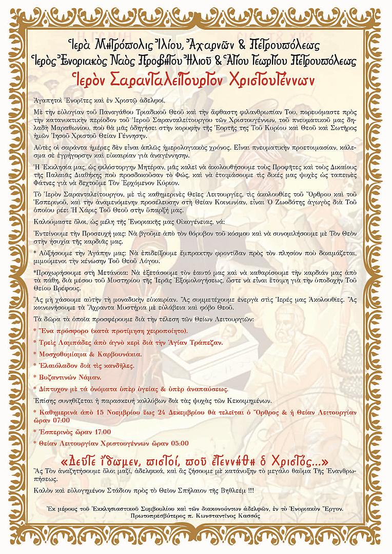Ανακοίνωση για το Ιερό Σαρανταλείτουργο των Χριστουγέννων της ενορίας Προφήτου Ηλιού Πετρουπόλεως.