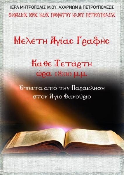 • Από την Τετάρτη 8 Οκτωβρίου 2025 και κάθε Τετάρτη στις 18:00, ιερά παράκληση στον Άγιο Φανούριο, ευλογία φανουρόπιτας και εν συνεχεία, μελέτη της Αγίας Γραφής, με θέμα τον Απόστολο και Ευαγγελιστή Ιωάννη.