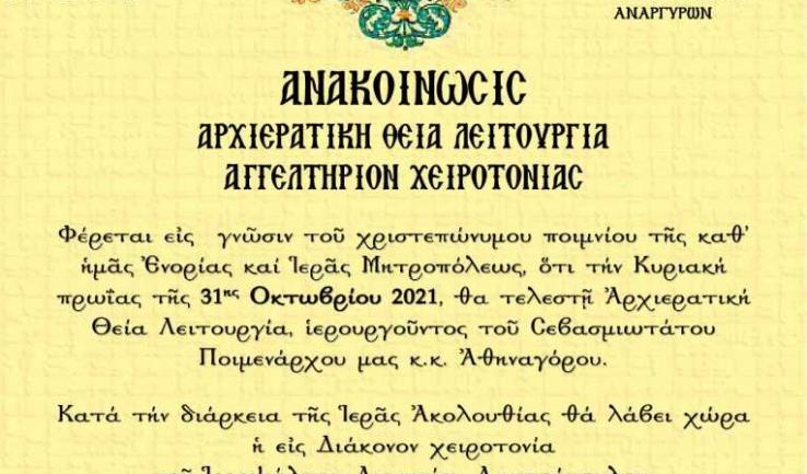 Αγγελτήριο χειροτονίας σε ιεροδιάκονο