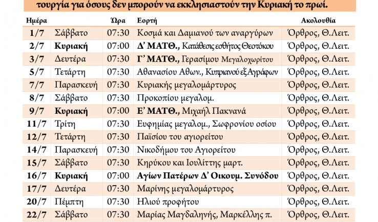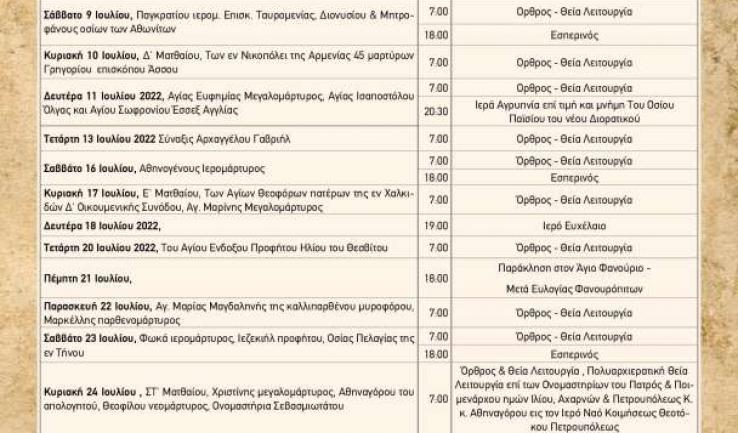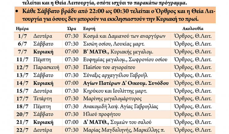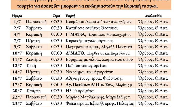 Πρόγραμμα ακολουθιών Ιουλίου 2022 ενορίας Αγ. Τριάδας Πετρ.